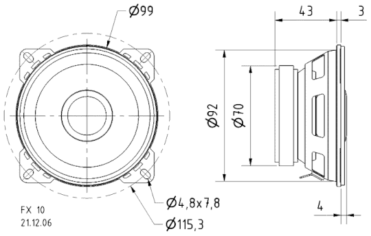 Title Value Rated power 40 W Maximum power 70 W Nominal impedance Z 4 Ohm Frequency response 70–22000 Hz Mean sound pressure level 84 dB (1 W/1 m) Opening angle (-6 dB) 88°/4000 Hz Excursion limit +/−2 mm Resonance frequency fs 110 Hz Height of front pole-plate 3 mm Voice coil diameter 25 mm Height of winding 6 mm Cutout diameter 93 mm Net weight 0.4 kg Connections 4.8 x 0.8 mm (+)2.8 x 0.8 mm (−) Temperature range –25 ... 70 °C
