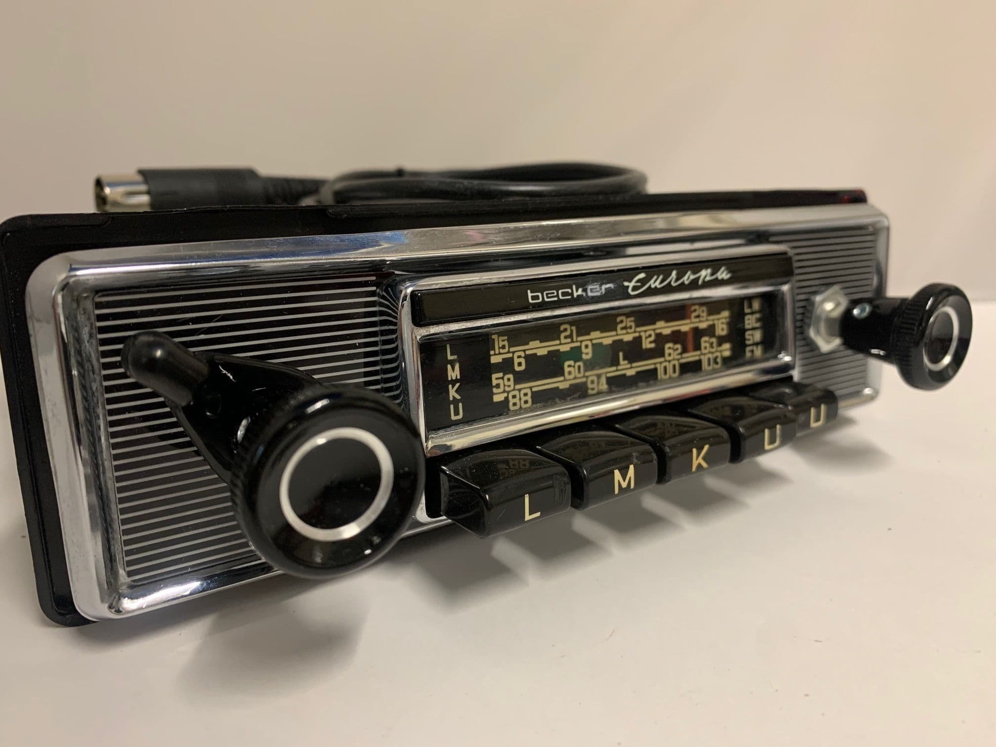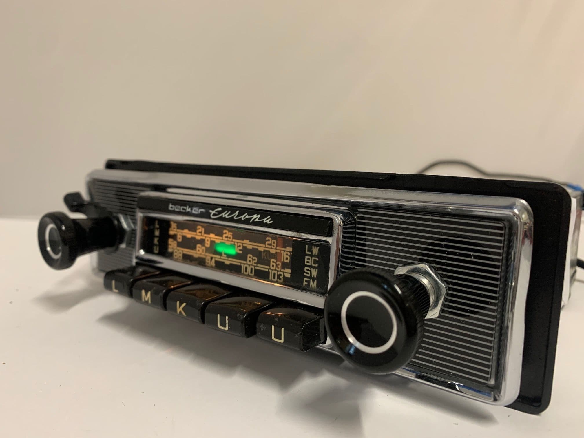 ABSOLUTE MUST HAVE FOR YOUR VINTAGE MERCEDES, FERRARI, JAGUAR OR ASTON MARTIN - AS PER FACTORY SPEC BECKER EUROPA SLIM FACE RADIO, INTERNALLY THIS RADIO HAS BEEN DIGITISED AND COMES WITH INTEGRATED FULL BLUETOOTH CONNECTIVITY INCLUDING HANDSFREE TELEFONY AND VOICE CONTROL, MODERN FOUR CHANNEL FM STEREO WITH MEMORY PRESETS ON THE BUTTONS, AM, AS AN OPTION WE CAN NOW ADD FULL CONTROL OF THE RADIO FEATURES VIA USB, INCLUDING A FREE PHONE APP, PLAYBACK / CHARGING . WE CAN ALSO ADD OPTIONAL DAB+.. THE MODERN INTERNALS MEANS ANY CURRENT SPEAKER SET UP CAN BE ADDED TO THE VEHICLE. OFCOURSE WE ALSO ADD FADE, BALANCE AND TONE CONTROL. EXTERNALLY THE RADIO IS FACTORY SPEC, WITH ALL NEW COSMETICS AND CORRECT FOR YOUR MERCEDES 111, 113, 112, THE SLIM FASCIA UNIT IS CORRECT WHERE APERTURES ARE LESS THAN THE 7''X2'' DIN OPENING ASTON MARTIN DB5/6/DBS/V8, FERRARI DINO, DAYTONA, 400, 512. JAGUAR ETYPE.