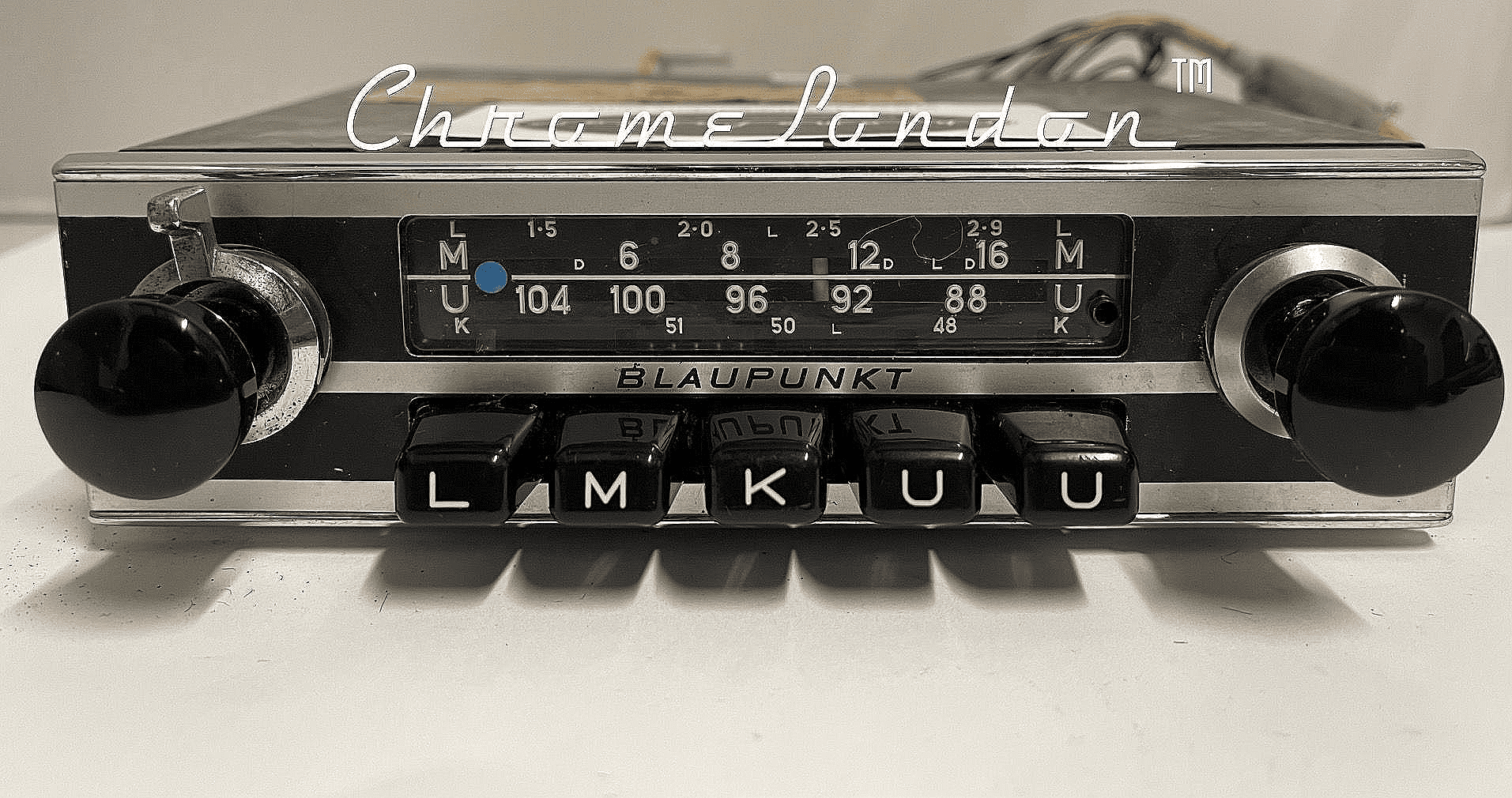 IN 100% OPERATIONAL CONDITION, FULLY SERVICED USING ONLY ORIGINAL PARTS. - FEATURING A BEAUTIFUL BLUE SPOT DIAL, BLACK HANDMADE BAKELITE KNOBS AND A DESIRABLE SOLID CHROME TWO TONE FACE , IDEAL FOR EITHER SPINDLE BEHIND AND THROUGH THE DASH INSTALL OR SLOT IN - REALLY WILL SET OFF YOUR DASH BEAUTIFULLY. MP3 UPGRADED, AUTOSWITCH LEAD OR FULL BLUETOOTH INC TELEFONY AVAILABLE AS OPTIONS PLAYS EXCEPTIONALLY WELL WITH CLARITY AND POWER INCLUDING PUSH BUTTON AUTOSEEKBLAUPUNKT FRANKFURT 12V POSITIVE/NEG- ON CHASSIS. MADE IN GERMANY