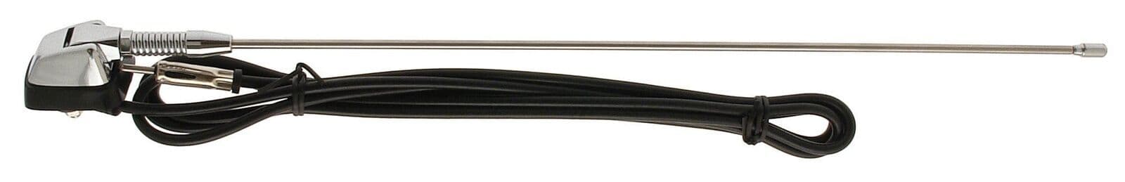 The pivot casting is chrome plated and the removable mast is a two- section telescope, measuring approximately 42 cm overall when retracted and 68 cm when extended. The base requires one 10 mm mounting hole, with a smaller 5 mm hole behind to accept a locating peg (although this smaller hole is not essential is you wish to remove the locating peg). The mast can be adjusted to any angle 0° to 90° to match the line of the windscreen a preferred rake, or achieve optimum signal strength.